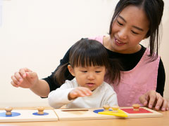 研修を受けたスタッフによるモンテッソーリの考え方を取り入れた保育・遊びになります。こどもの成長要求をくみ取りつつ、責任感と思いやりをもった自立的な人間を育てることを目的としたモンテッソーリ教育を導入しています。